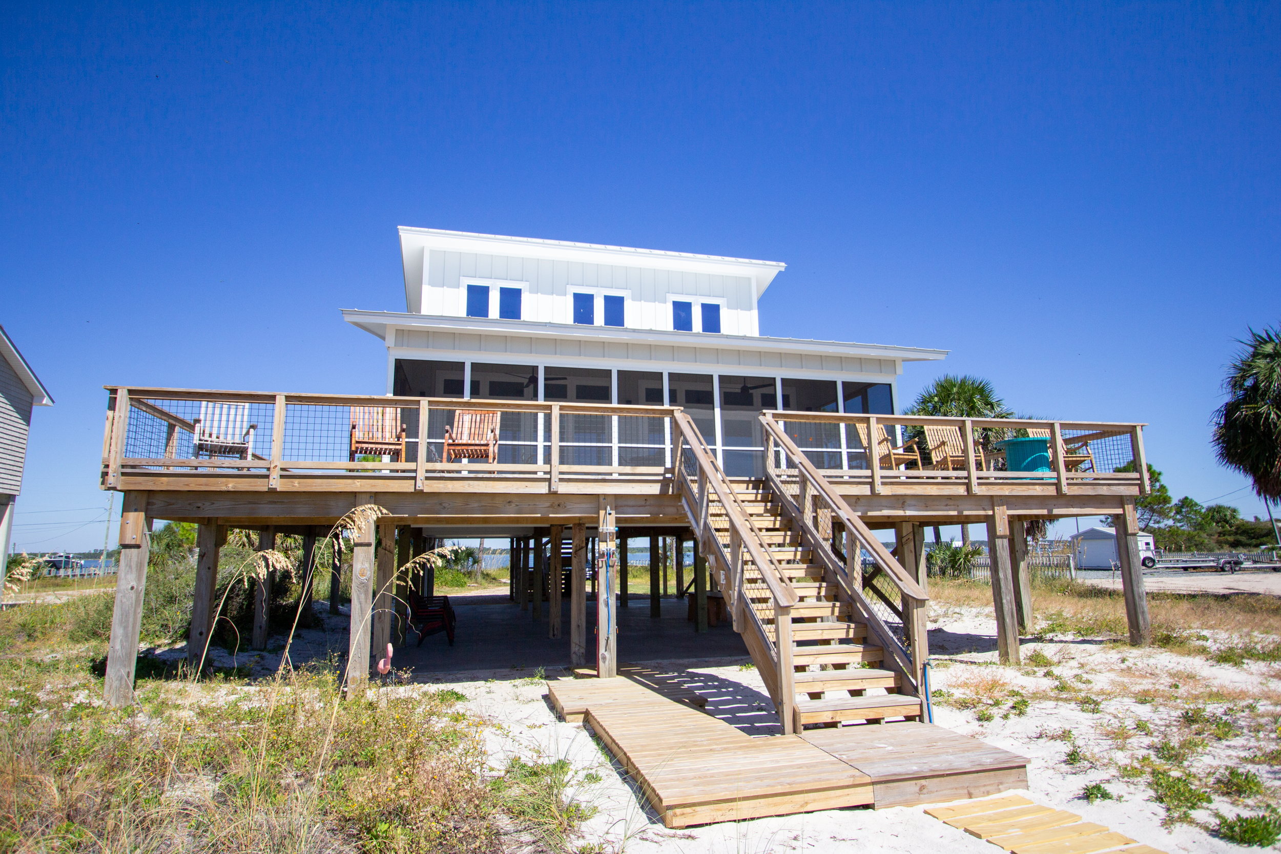 Newly Remodeled (Fall 2025)! Escape to this serene, completely renovated house in picturesque Alligator Point. Featuring 3 spacious private bedrooms including 1 king and 2 queen beds, 4 bathrooms and a second upstairs living area with two twin beds. Located directly on a pristine beach, enjoy ocean or bay views from every room. This charming retreat is perfect for guests seeking a cozy getaway. Relax on the screen porch listening to the waves and watching the dolphins play or step out on to the huge deck and porches to soak in the sun. Perfect house to make family memories or a beach getaway with friends. The three bedrooms comfortably sleep 6 adults with option for up to 8 guests including the two twin beds in the upstairs loft. As one of the last truly private beaches, Alligator Point is a true hidden gem.